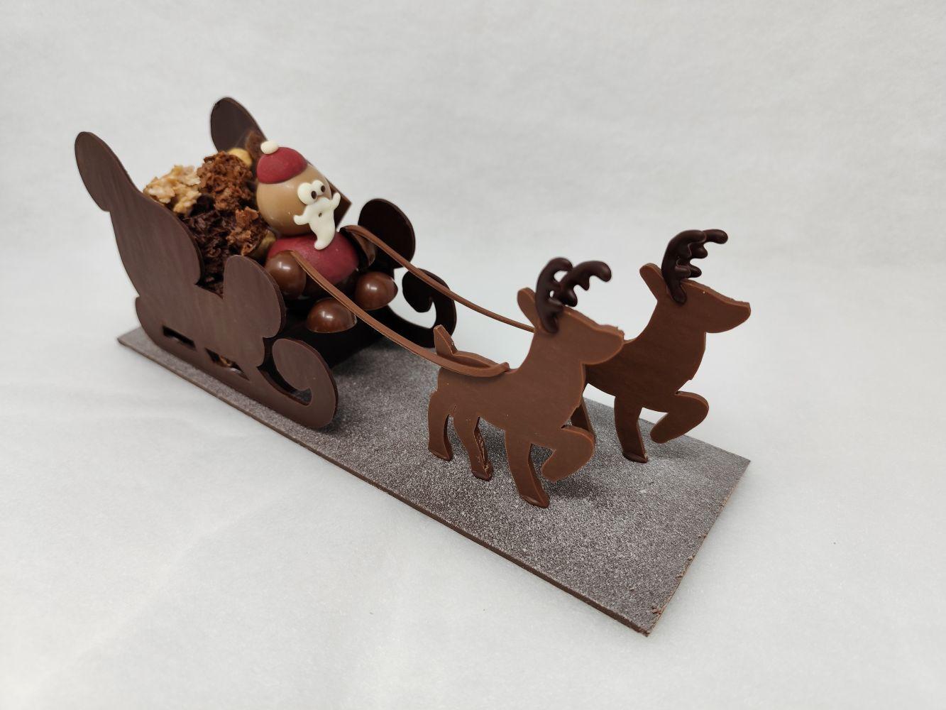 Le traineau est garni de friolles, mendiants, noisettes caramélisées et amandes caramélisées