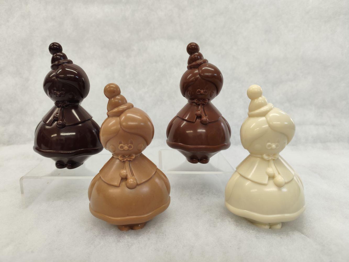 disponible en chocolat noir, lait, blanc et blanc noisette