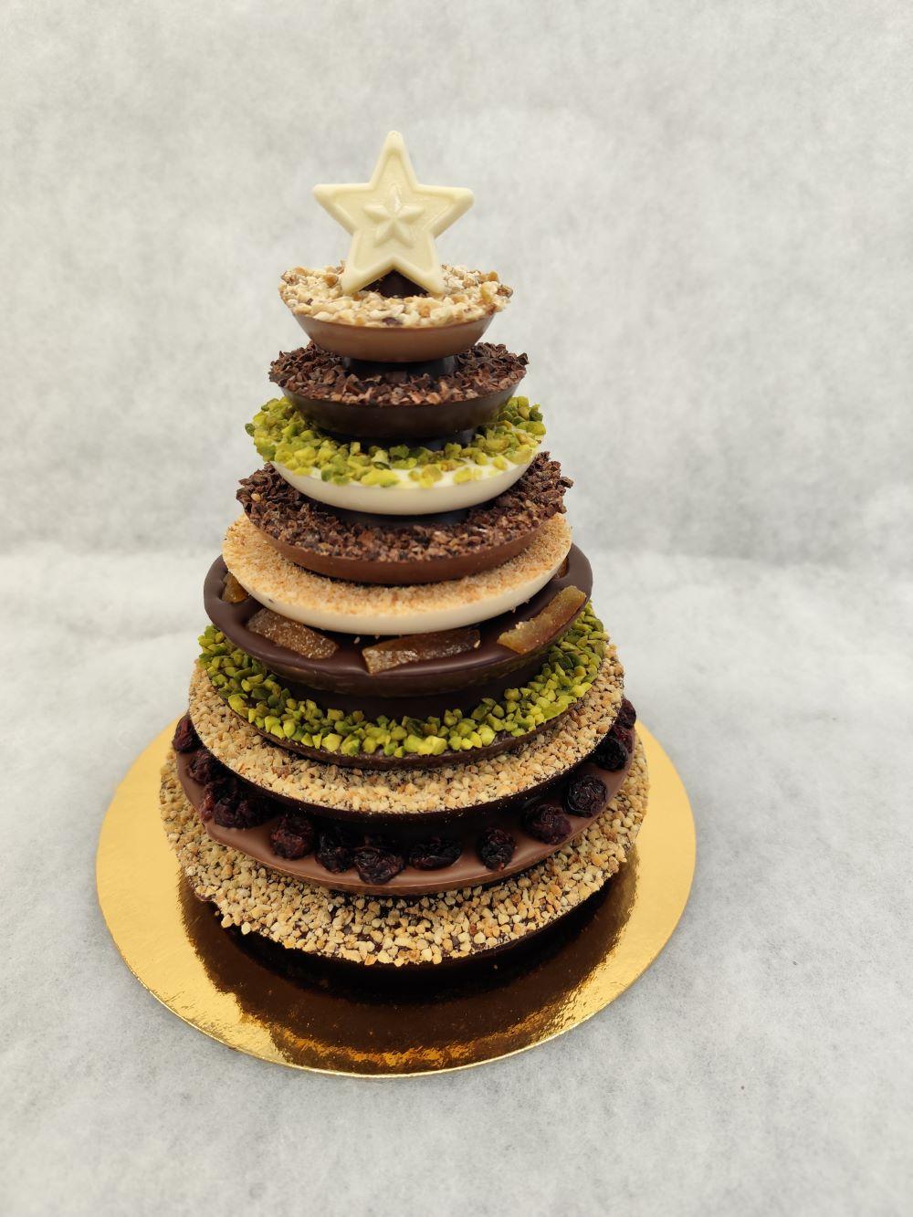 Montage en chocolat noir, lait,blanc et blanc noisette façon mendiant