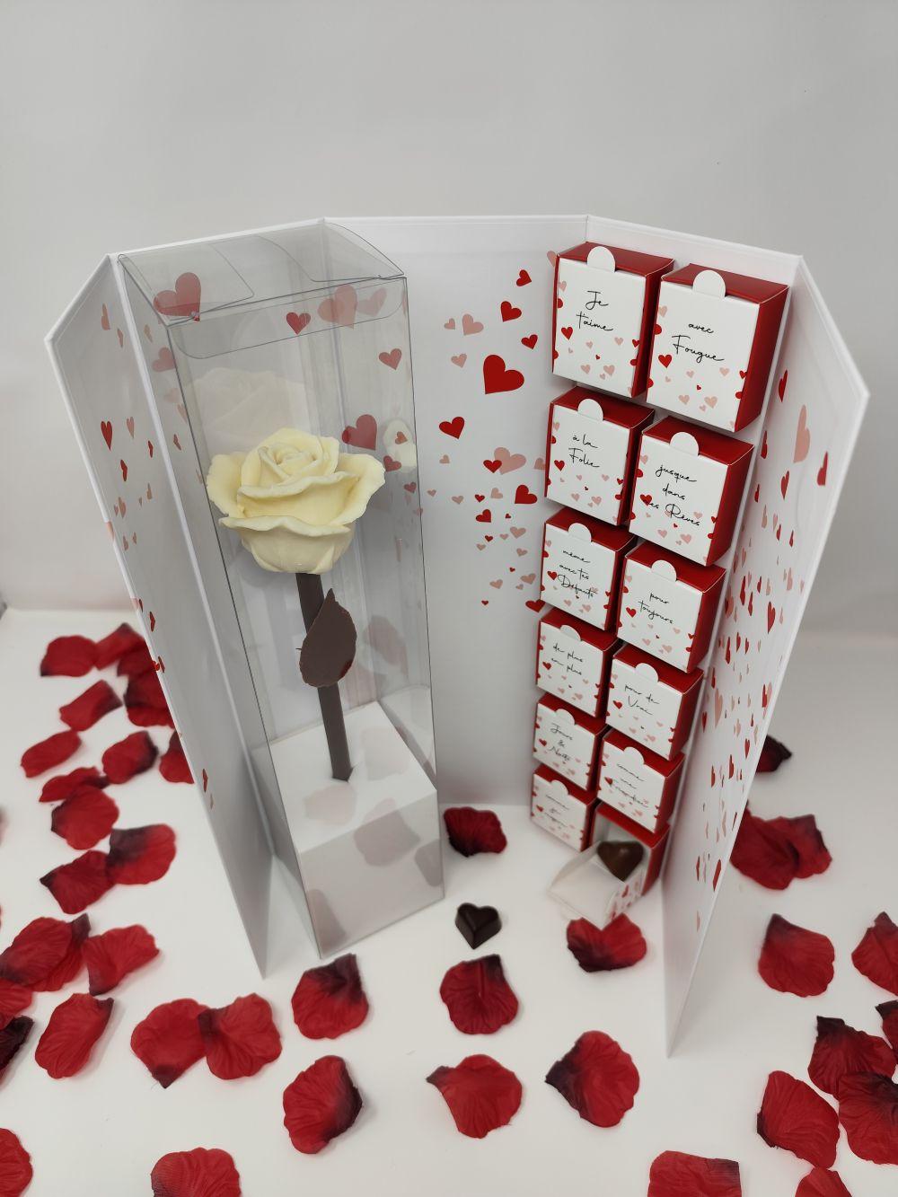 Boîte composée d'une rose en chocolat et de 12 chocolats fins
